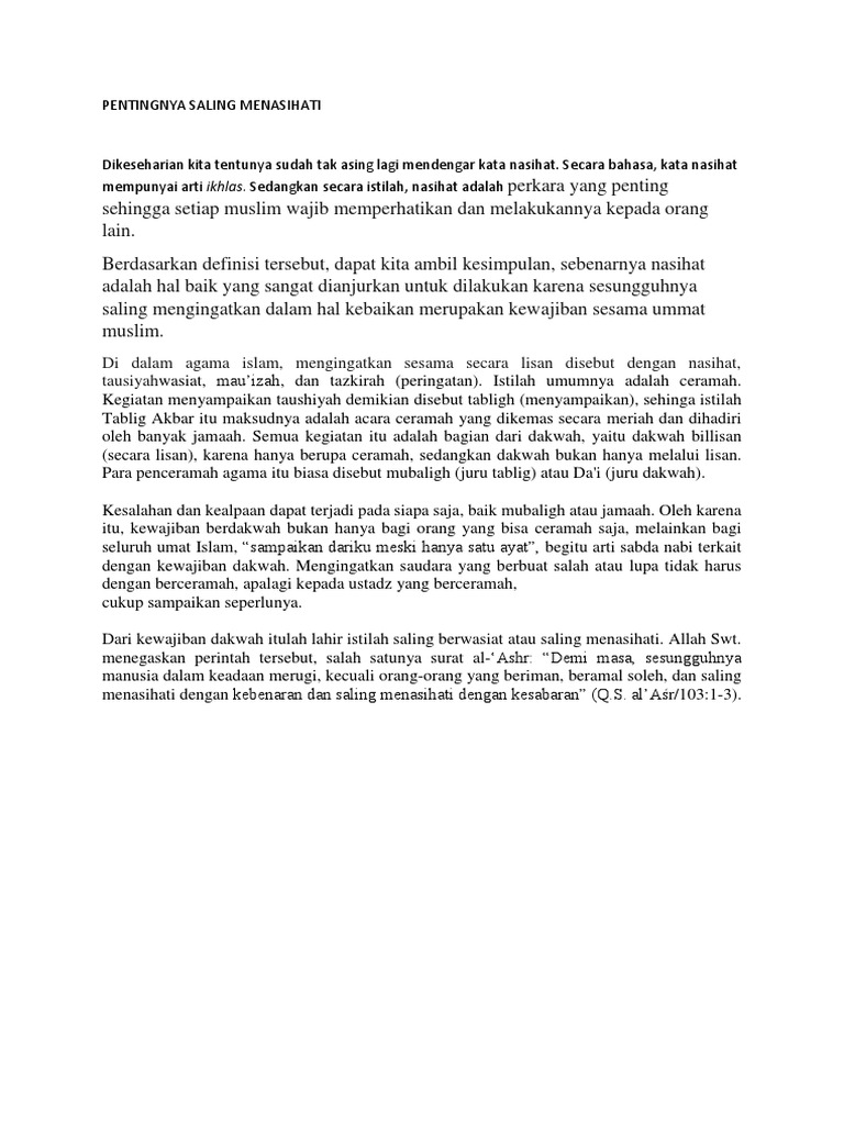 Kecuali orang-orang yang beriman dan mengerjakan amal sholih saling menasihati supaya menaati kebenaran dan saling menasihati supaya tetap di atas kesabaran QS. Dengan adanya nasihat maka agama Islam akan senantiasa termanifestasi dalam jiwa. Agama adalah nasihat bagi orang awam dari umat Islam rakyat biasa bukan pemimpin maksudnya bahwa tegaknya agama hanyalah dengan memberikan kasih sayang kepada orang-orang kecil memperhatikan kepentingan mereka mengajari apa-apa yang bermanfaat bagi mereka dan menjauhkan semua hal yang membahayakan mereka.